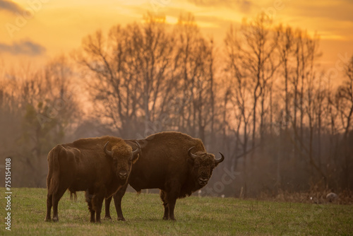 The European bison (Bison bonasus) or the European wood bison in the sunset