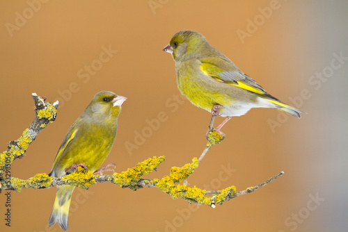 The European greenfinch Chloris chloris or common greenfinch songbird winter time blue background