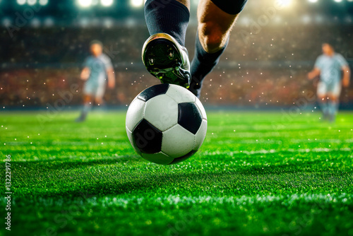 The exciting moment a footballer's foot hits the ball during a thrilling match at the stadium in the evening