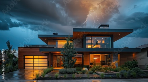 The exterior of a Suburban Modern home during a thunderstorm, showcasing its durable materials and modern design standing against the elements