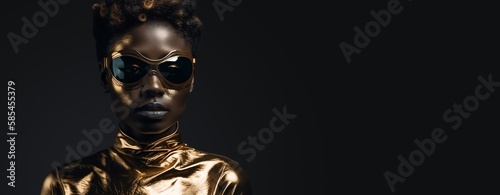 The face of a black woman wearing sunglasses, golden clothes, golden paint on her face. Illustration of a horizontal banner. AI.