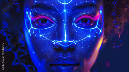 person, portrait, woman, make-up, surreal, neon, black, art, face, female, african, futurism, futuristic, fashion, style, modern, beautiful, blue, technology, ultraviolet, night, afro, light, dark, cyber, model, head, purple, girl, inspiring, concept, hair, human, imaginative, fiction, glamour, machine, robotic, violet, lighting, lady, saturated, eye, skin, simulation, digital, robot, apocalypse