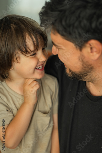 the faces of the father and son are close-up, the father spends time with his son, he talks to him, they laugh and smile, the concept of a happy family