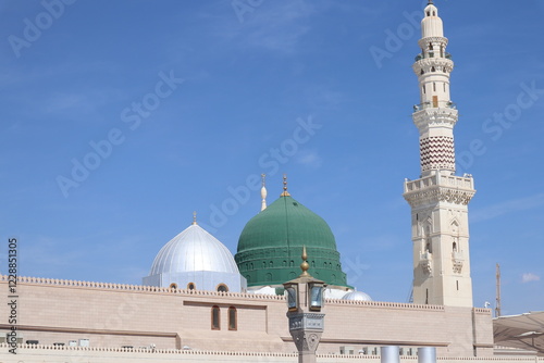 The famous Green Dome and minarets of the Holy Prophet's Mosque or Masjid Nabawi in Medina, Saudi Arabia.