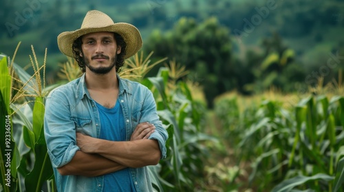 food, men at work, portrait, man, young, farmer, farming, mature, nature, agriculture, outdoors, harvest, farm, green, growth, field, photogenic, hat, mountain, male, plant, adult, jean, traditional, environment, serious, corn, countryside, crop, rural, economy, plantation, landscape, standing, sustainable, cultivation, productive, vegetation, ethnic, activity, agronomy