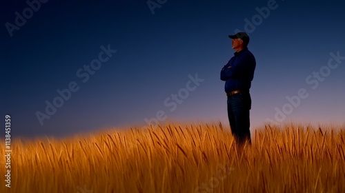 The Farmer's Horizon: A solitary figure stands amidst a golden field of wheat, silhouetted against a deep blue sky. The image evokes a sense of peace, contemplation.