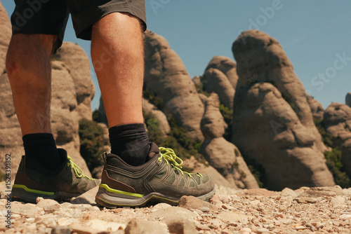 The feet of a hiker hiking high in the Montserrat mountains (Barcelona)