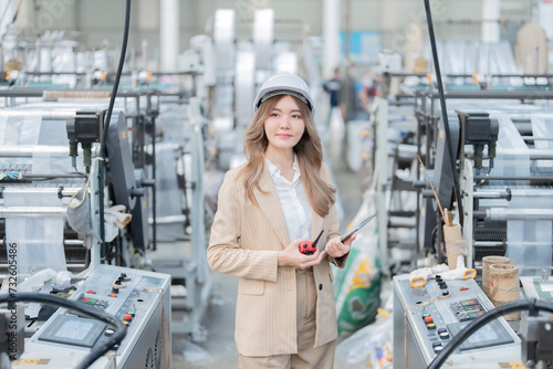 The female presenter is an Asian engineer. Owners of factories and export businesses, plastic and steel companies, stand smart near working machinery, producing products for export to the world market