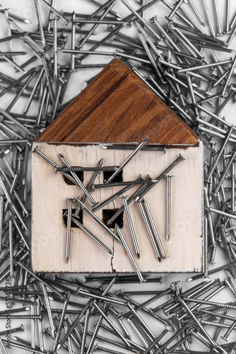 The figure of a wooden house. Old cracked build in a pile of metal repair nails