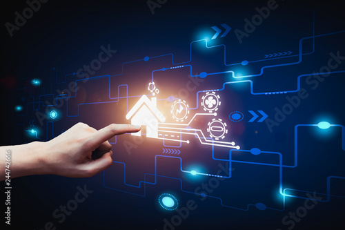 The finger presses the command to the smart house, Smart home automation control system.