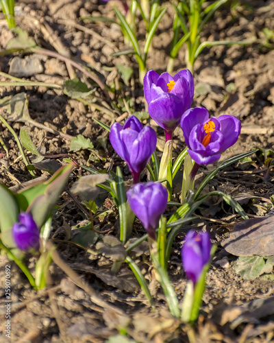 The first spring purple flowers crocuses in the garden in St. Petersburg.