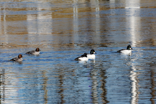 The flock of common Goldeneye (Bucephala clangula), drake on the river.