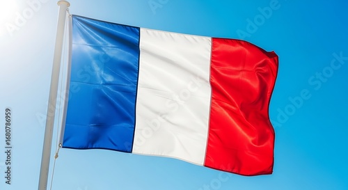 The french flag waving in the wind against a clear blue sky on a sunny day