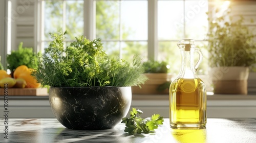 herb, kitchen, cooking, oil, vegetable, freshness, home, culinary, ingredient, sunlight, greener, glasses, container, decoration, natural, healthy, favor, parsley, dill, bowl, food, organic, lifestyle, rustic, preparation, closeup, bright, vibrant, counter, scenery