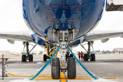 The front landing gear of the aircraft standing on the refueling at the airport.