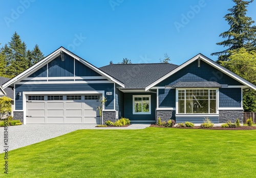 the front view, a wide-angle shot of a blue and gray craftsman-style home with large windows on both sides of the garage door, set in a lush, green lawn