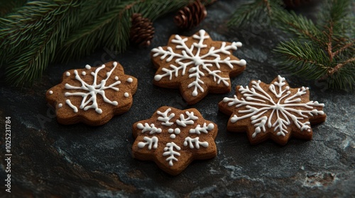 cookie, gingerbread, decoration, holiday, baking, festive, sweet, snowflake, icing, confection, winter, treat, dessert, party, hand-made, traditional, celebration, delicious, cocoa, cinnamon, aroma, brown, green, pine, rustic, background, table, edible, creative