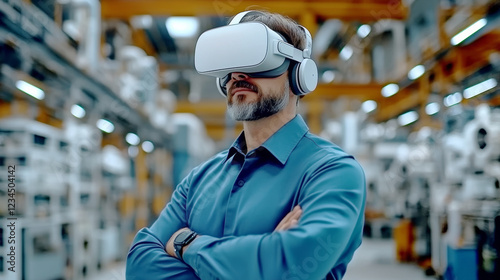 The Future of Manufacturing: A focused engineer or factory worker wearing a VR headset in a modern industrial setting, showcasing the potential of virtual reality technology to revolutionize training.