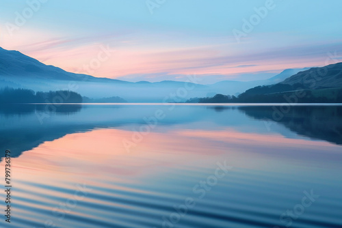The gentle, rhythmic pattern of waves on a tranquil lake, with the water's surface reflecting the soft hues of the sky at dawn.