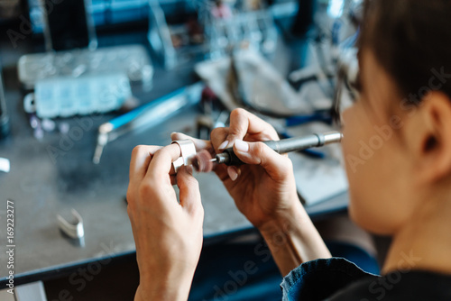 jewellery, workshop, craft, girl, designer, woman, fashion, manufacturing, tool, workbench, 20s, alone, assured, brunette, caucasian, creativity, desk, display, expertise, female, gold, hobby, holding, horizontal, individuality, jeweller, lamp, merchandise, necklace, 1, fixed, clockmaker, attention, condensed, careful, finger, chisel, gem, looking, delicately, skill, toothy, elaborate, attend, working, person, fix, prepare, garnish, pretty