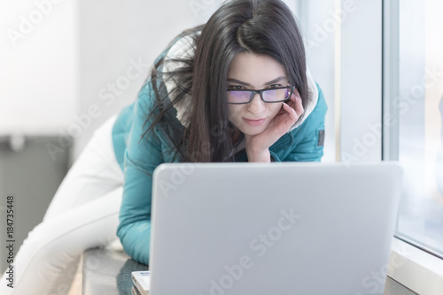 the girl wearing spectacles in casual clothes of mint color works with a laptop on the Internet