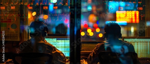 The glowing screens of financial traders working late into the night, under the pressure of economic instability