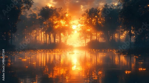 The golden hour casts a magical glow over a still lake, reflecting the sun's rays through the misty forest.