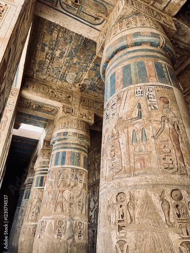 The grand columns of Medinet Habu Temple in Egypt, a striking example of ancient Egyptian architecture, showcasing intricate carvings and timeless history.