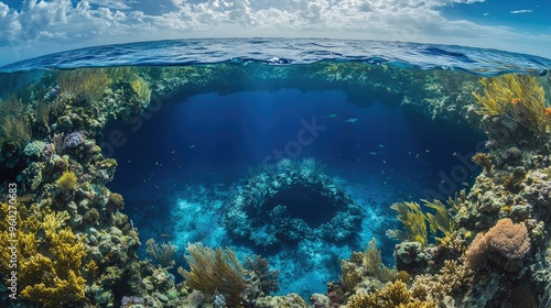The Great Blue Hole coral formations teeming with fish, against the backdrop of deep blue water.