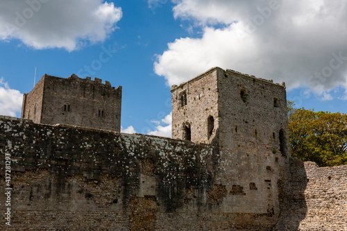 The great Norman Keep of Portchester Castle, Ashton's Tower on the right, and the walls of the Inner Bailey, Portchester, Hampshire, UK, from the outer Bailey