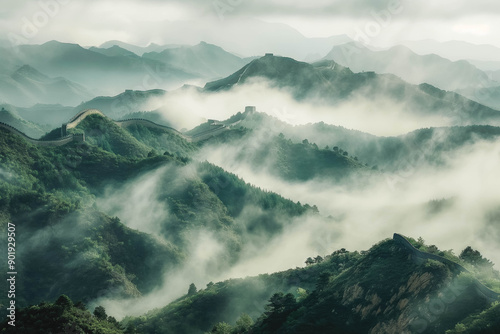 The Great Wall of China snaking over mountainous terrain in the early morning mist.