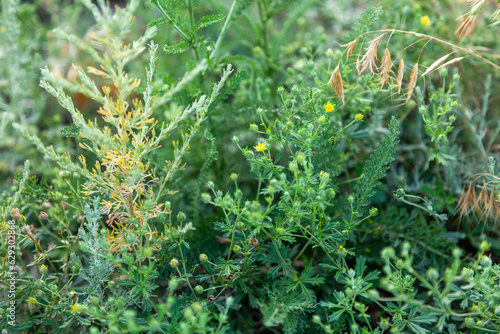 The green abstract texture plant leaves with small yellow flowers in the summer meadow.