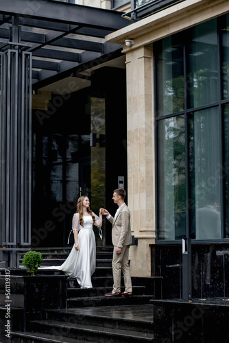The groom gives his hand to the bride walking down the stairs. Shooting on the wedding day