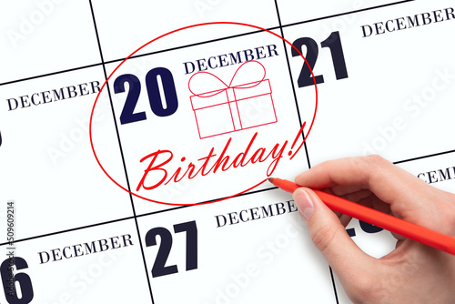 The hand circles the date on the calendar 20 December, draws a gift box and writes the text Birthday. Holiday.