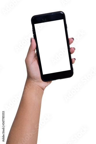 The hand is holding the white screen, the mobile phone is isolated on a white background with the clipping path.
