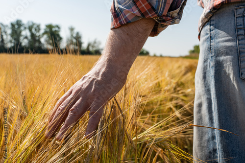 The hand touches the ears of barley. Farmer in a wheat field. Rich harvest concept