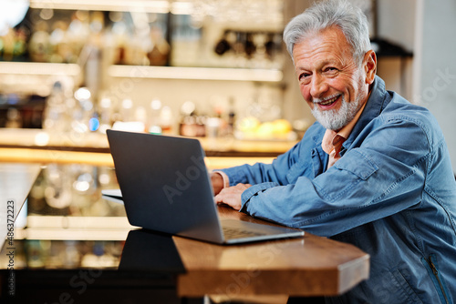 The happy senior student is sitting at his home and studying for an exam. Senior using the laptop for studying.