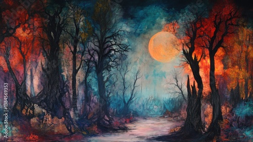 forest, moon, path, high-coloured, mystical, vibrant, colours, full, to illuminate, foliage, ambience, darkness, vibe, whisper, legend, campfire, experiencing, spirit, folklore, view, twilight, night, nature, phantom, silence