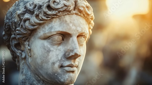 The head of an ancient Greek statue with weathered features, positioned against a clean, minimalistic background, showcasing its historical elegance.