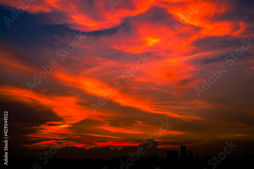 The high angle background of the city view with the secret light of the evening, blurring of night lights, showing the distribution of condominiums, dense homes in the capital community