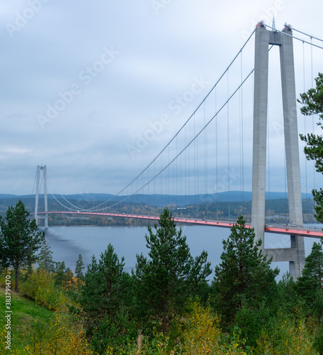 The High Coast Bridge in Sweden. It is a suspension bridge over the Angerman river between Kramfors and Harnosand municipalities in Adalen.