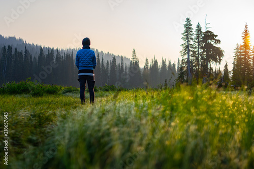 The Hiker Standing at Mount Rainier National Park During sunrise