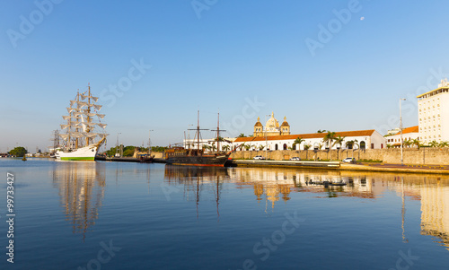 The historic Colombian Tall Ship and old pirate ship moored at the port of Cartagena. Ship and churches reflection in Caribbean waters in Cartagena, Colombia.
