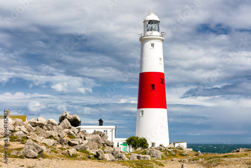The historic Portland Bill lighthouse, a famous landmark on the Jurassic Coast in Dorset