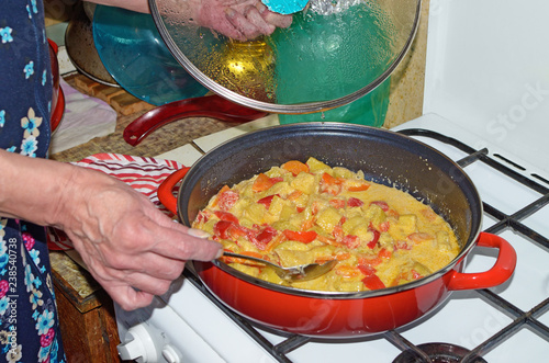 The hostess puts out the vegetables on a gas stove.
