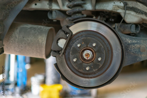The hub of a wheel in a car service. Suspended car with no wheels. Suspension of car in service room.The car lift up by lifter for maintenance suspension and cleaning parts. Close up