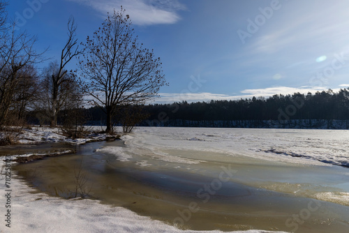 the ice-covered surface of the river in the winter season