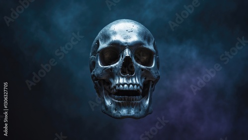 the idea of Halloween festivities featuring a metallic skull with an open mouth against a blue backdrop. render.