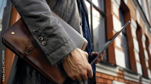 The image captures a person dressed in a stylish gray suit holding a tablet and a leather briefcase, exuding professionalism and readiness in an urban environment.