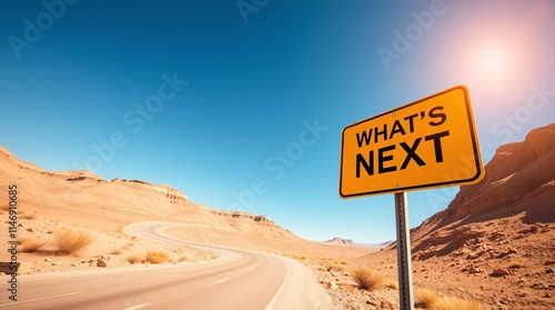 the image depicting an epic, grand scene of a desert landscape with a winding road, clear blue sky, and a yellow road sign reading WHAT'S NEXT in bold black text.